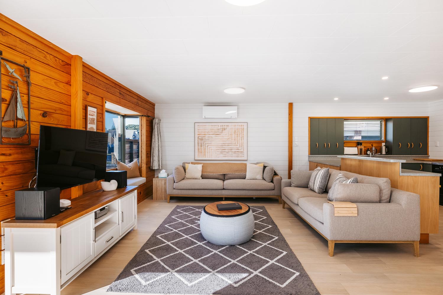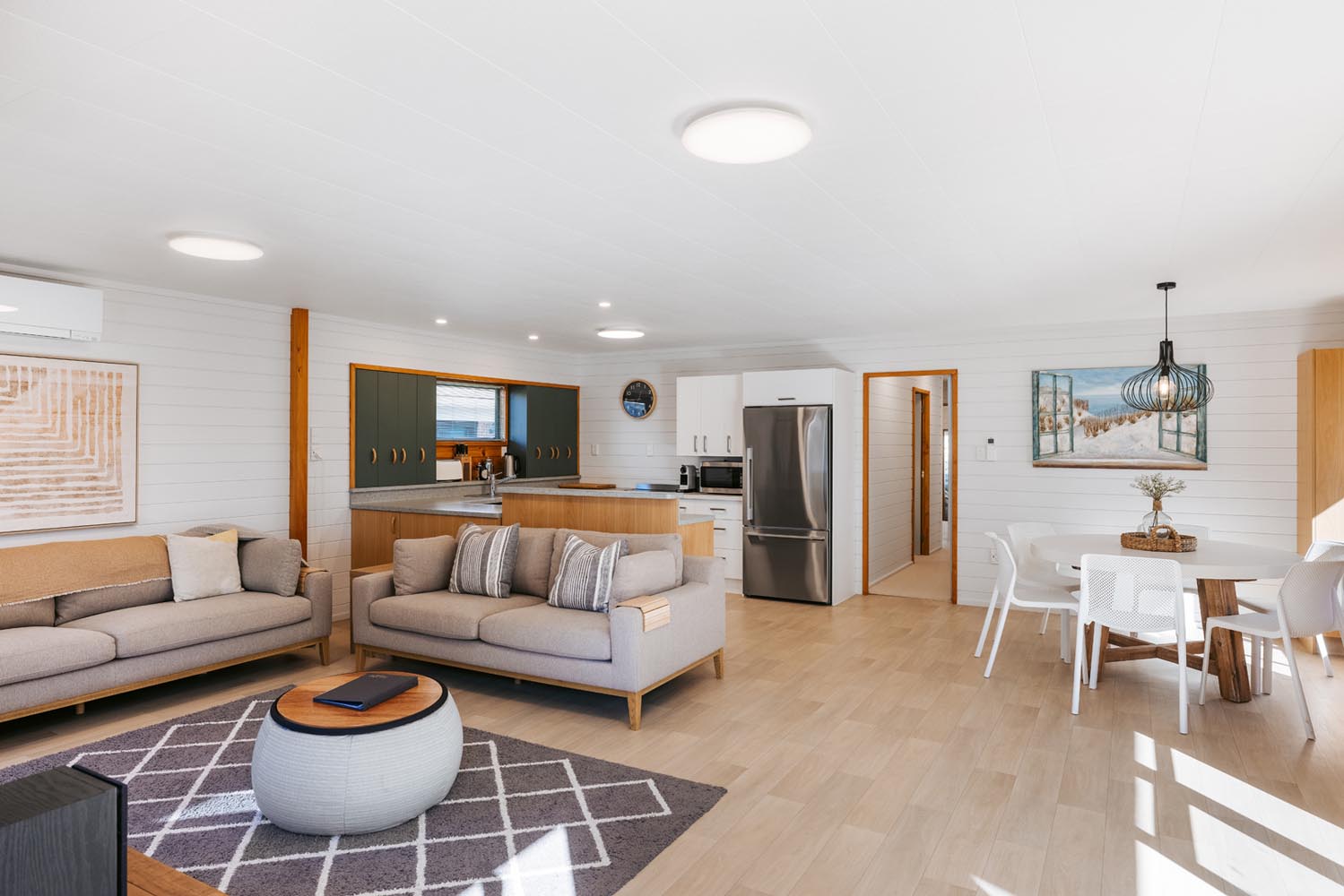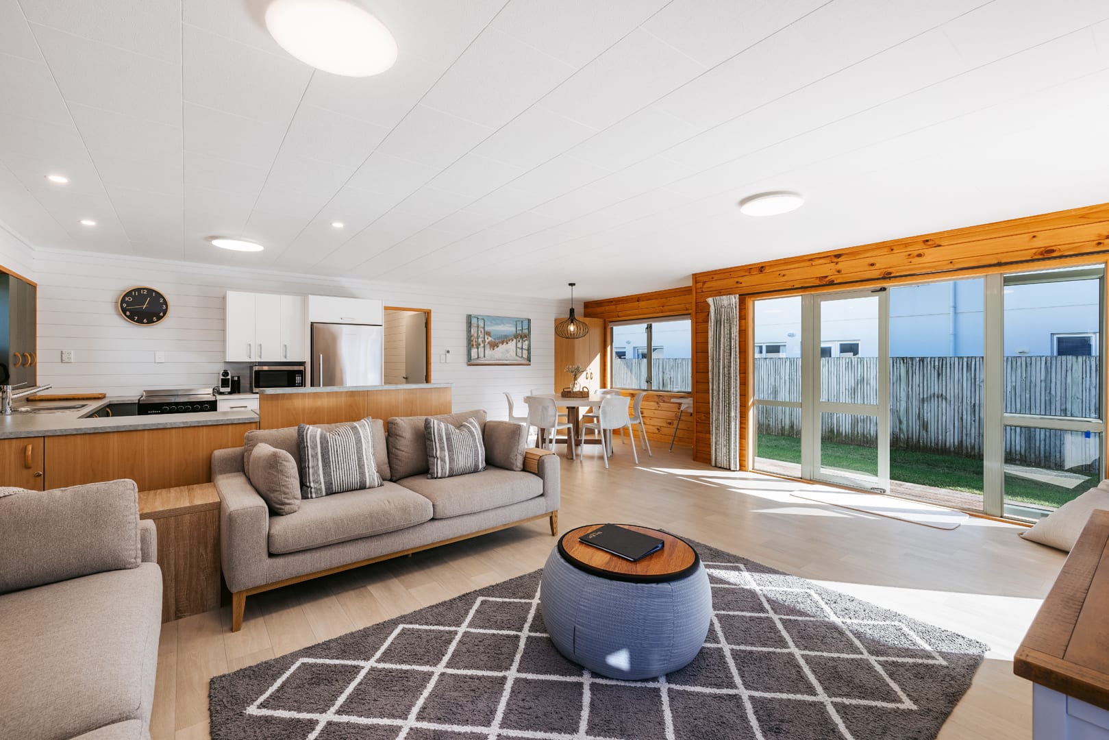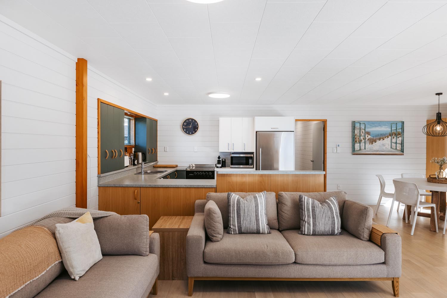 The main living area provides plenty of space and open plan living. The kitchen is fully equipped including coffee machine, comfortable couches and window seat, Quality bean bags for the kids. The main living leads to an outdoor built in seating area, catching the morning sun. Enjoy a coffee and watch the world go by.