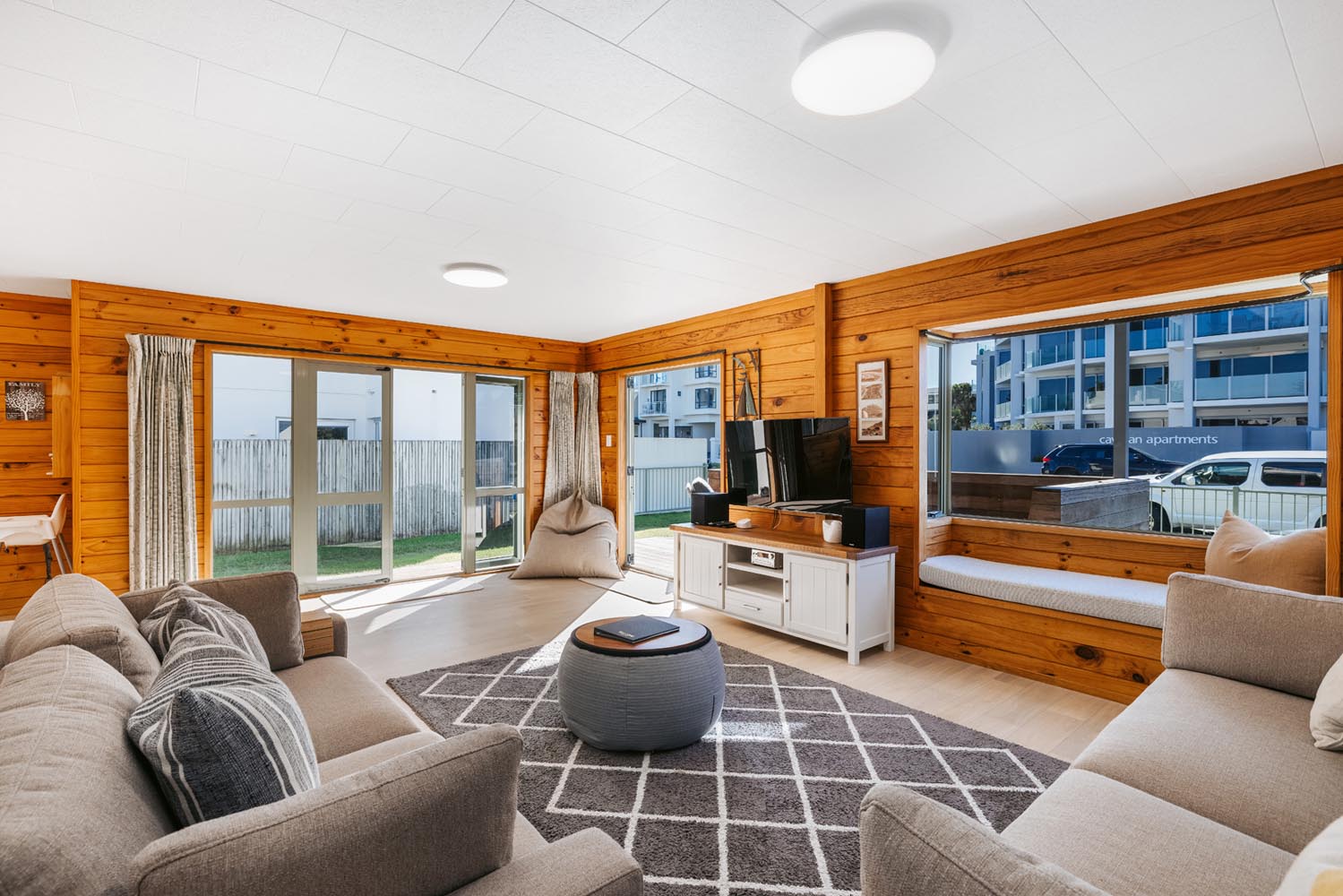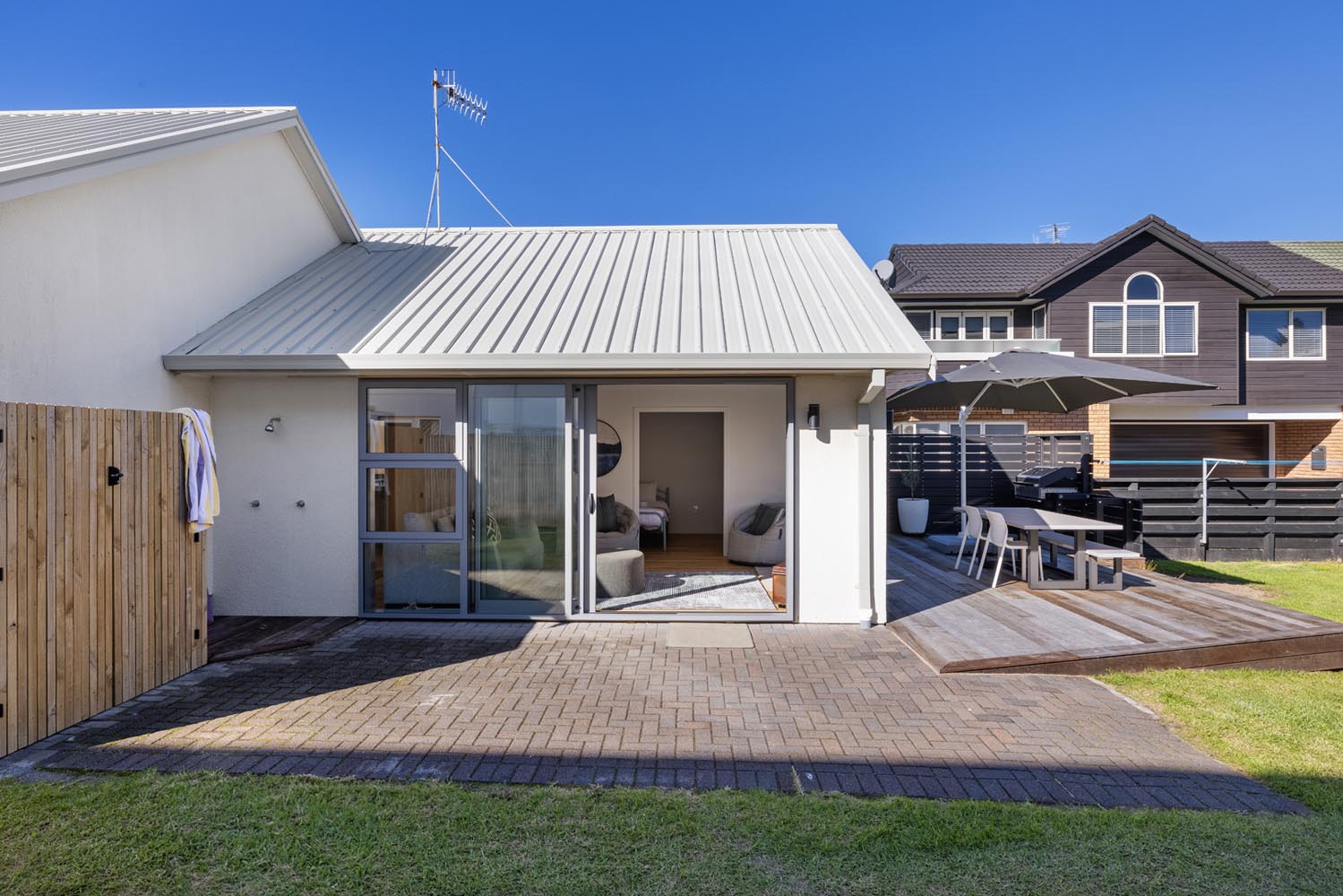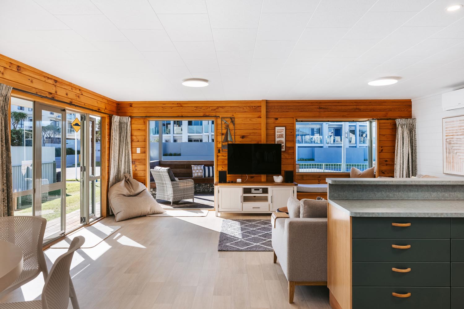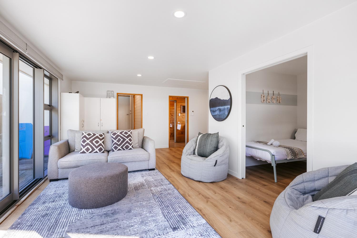 There is a second living area with large stacking doors opening to back section and outdoor BBQ deck. This living room has a pull down queen bed, bunk room for the kids, additional sofas and bathroom. A great space to enjoy the afternoon sun over a BBQ and drinks, while watching the kids play.