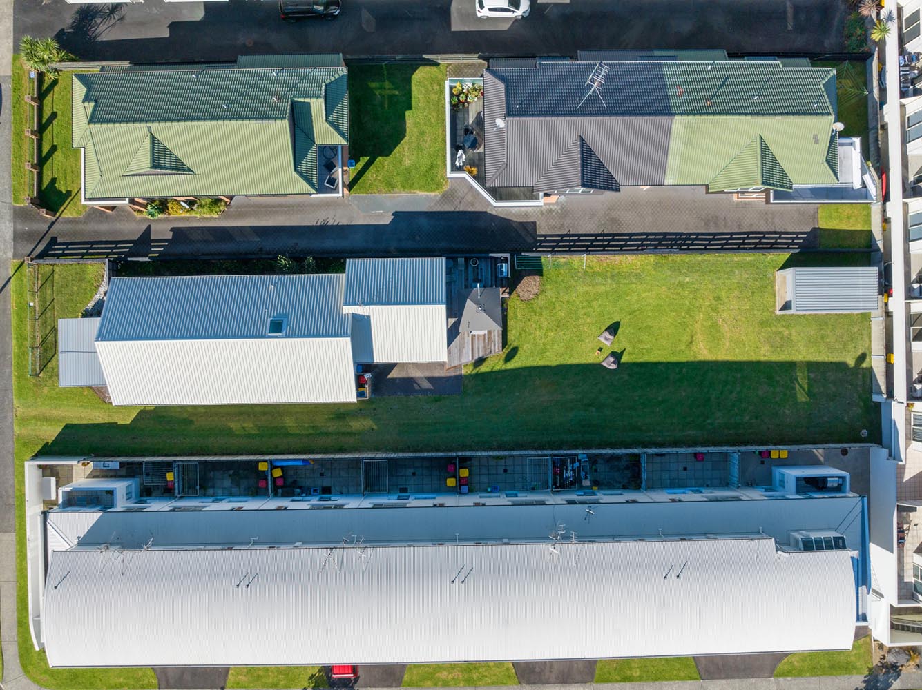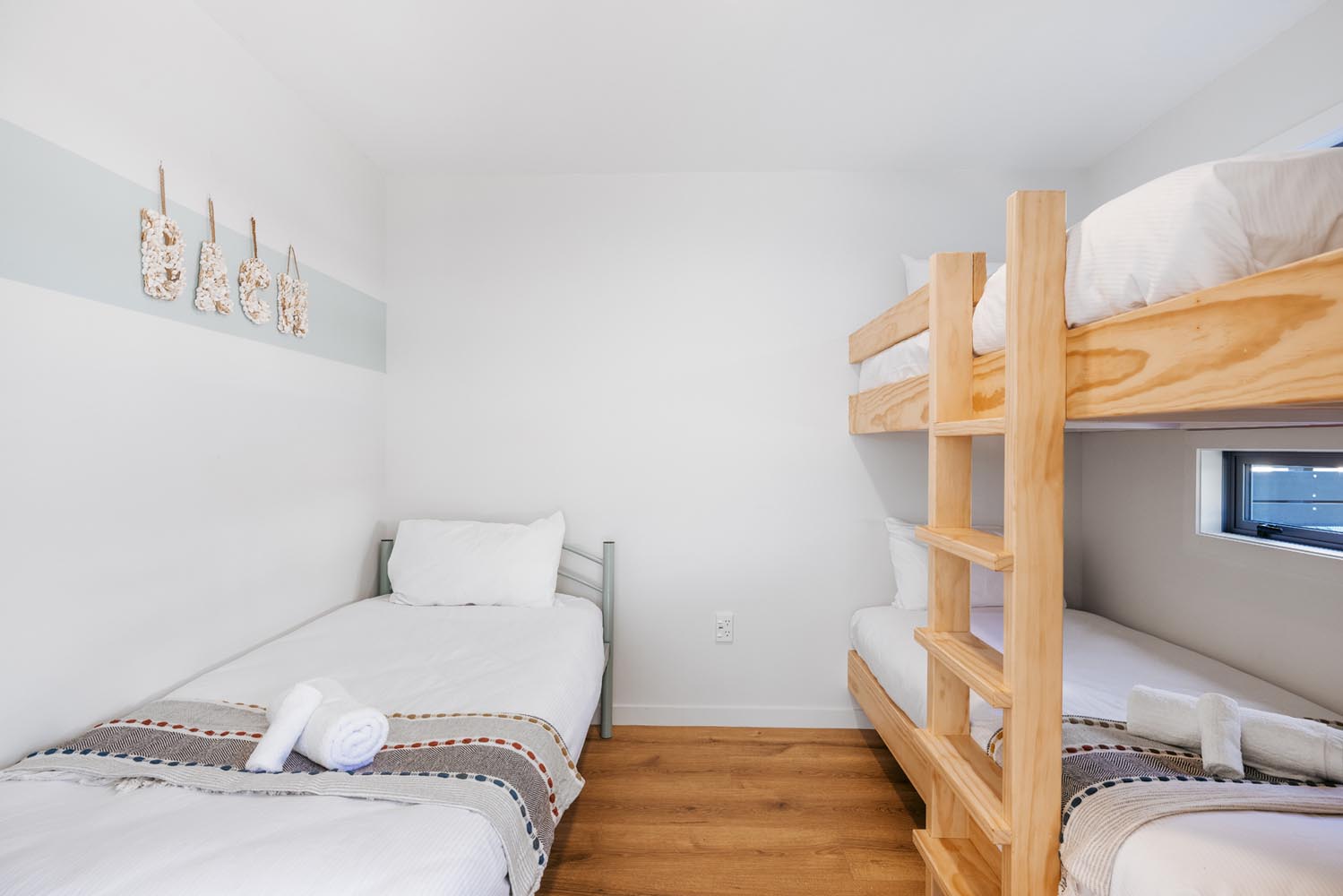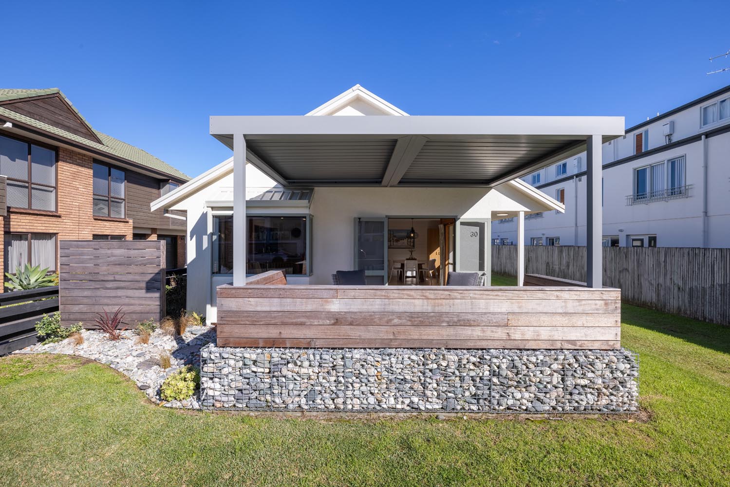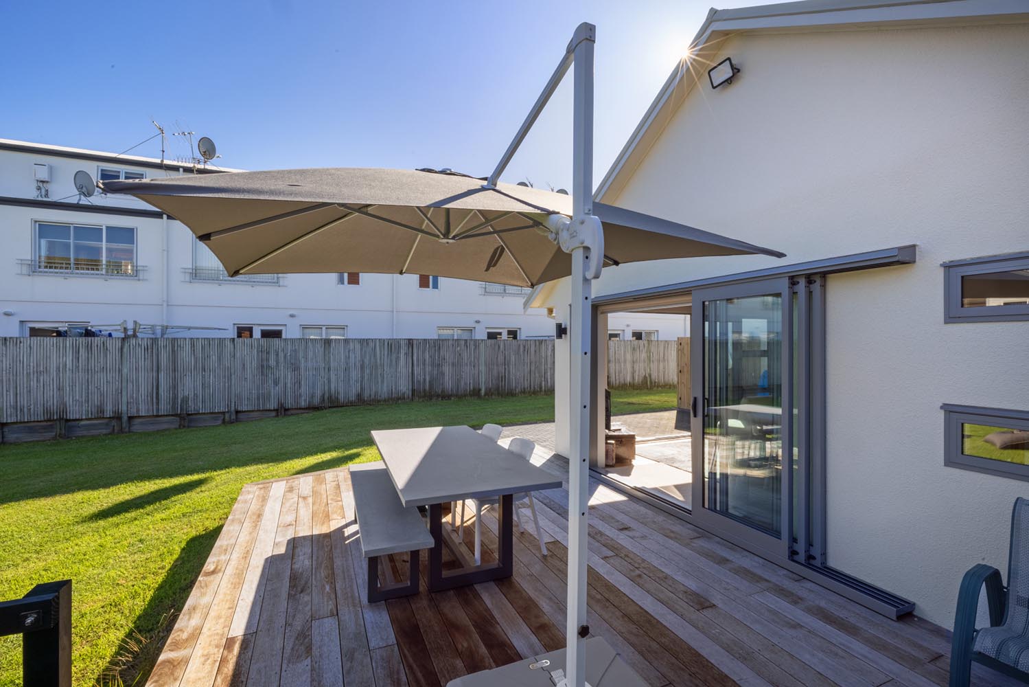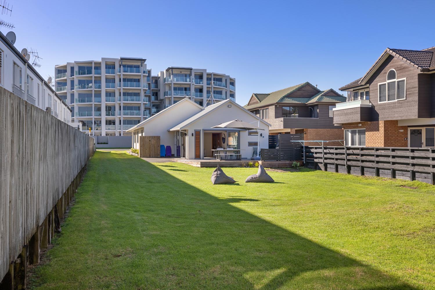 There is a second living area with large stacking doors opening to back section and outdoor BBQ deck. This living room has a pull down queen bed, bunk room for the kids, additional sofas and bathroom. A great space to enjoy the afternoon sun over a BBQ and drinks, while watching the kids play.