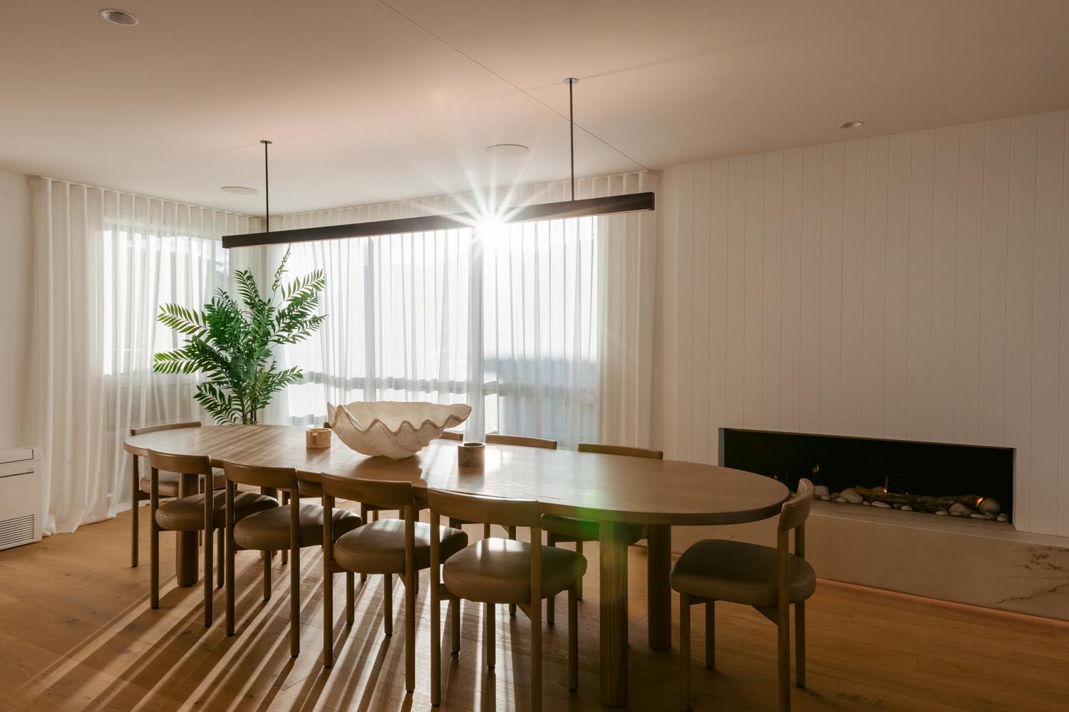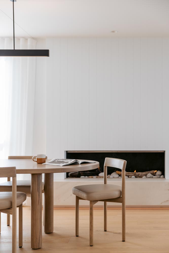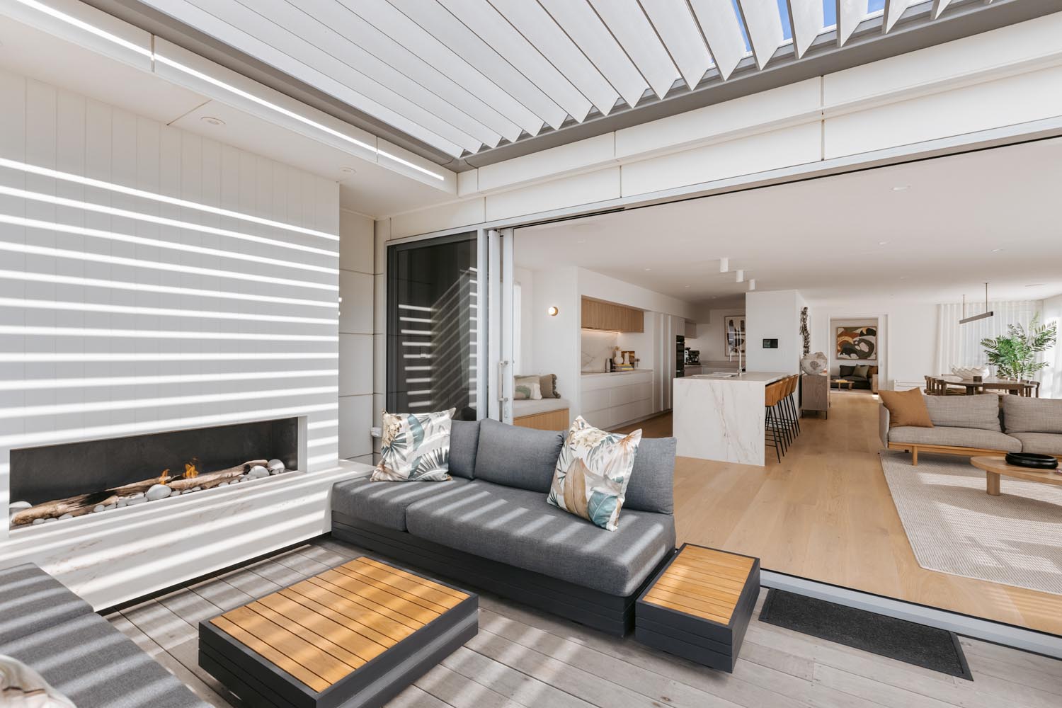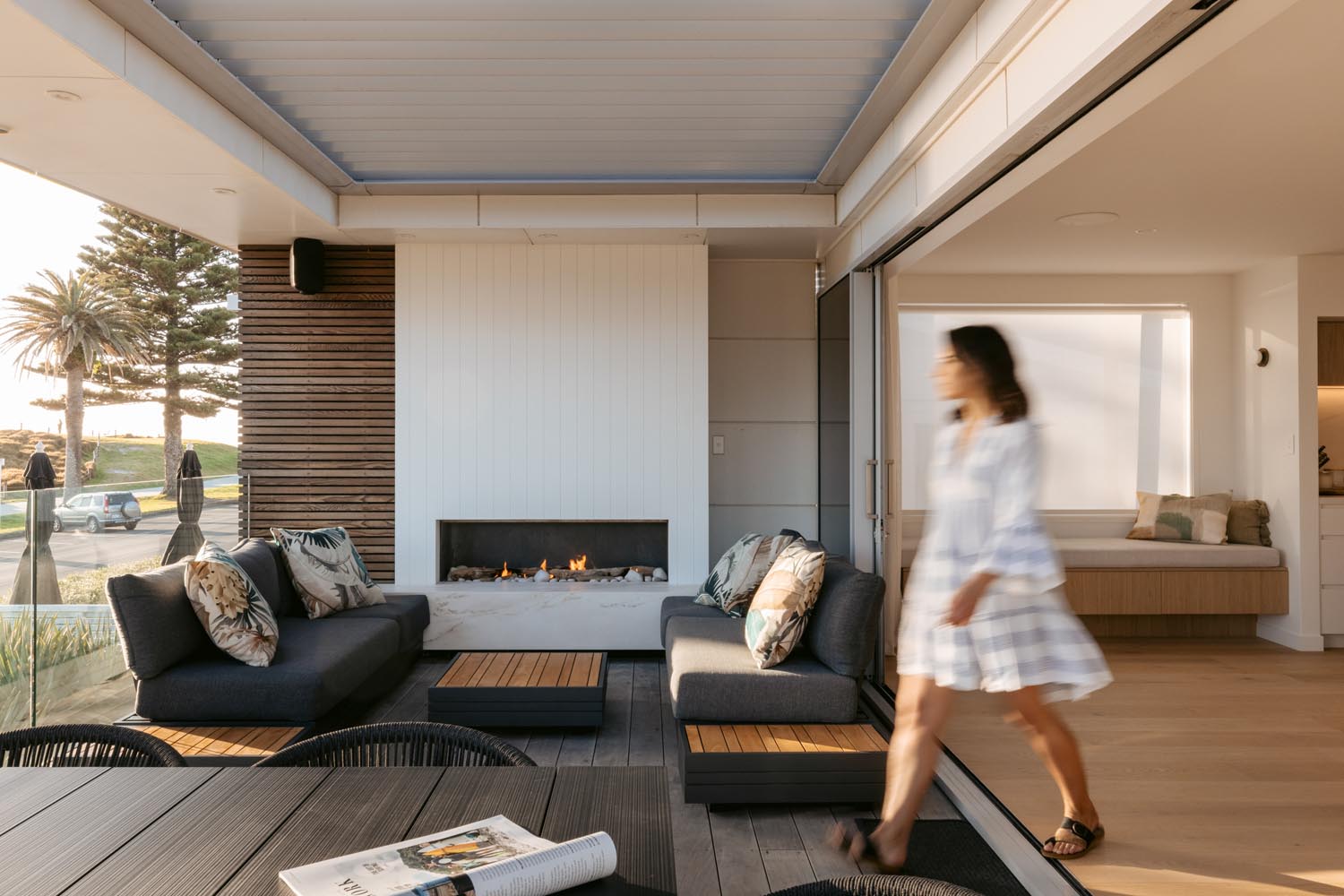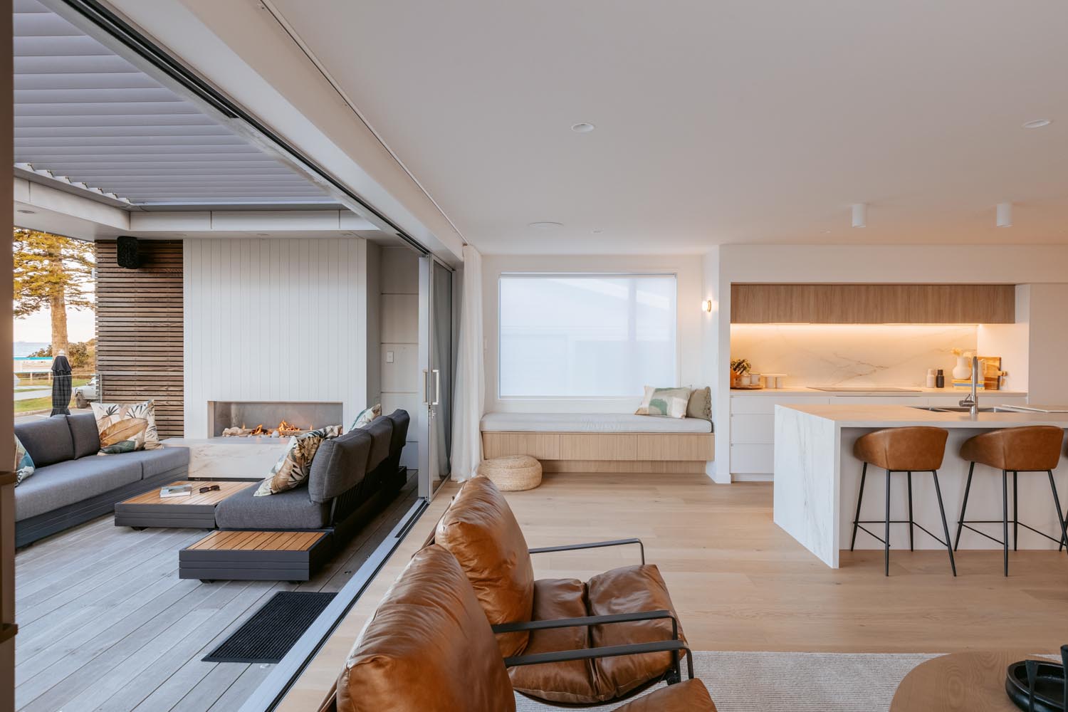 rooms that beckon you to unwind and the living space opens to an expansive deck where you can sit and take in the beautiful ocean panoramas. An outdoor fireplace provides the perfect ambiance, an ideal place to relax with a drink, adding a touch of magic to your evenings. With a state-of-the-art design and ample space in the butler’s pantry, the kitchen offers all the modern conveniences you could need. The easy-to-use home automation system allows you to effortlessly set the mood and environment of the house to your liking. The open-plan dining space enables you to host gourmet meals in style and features a large gas fire, setting the ambience for unforgettable dining experiences.