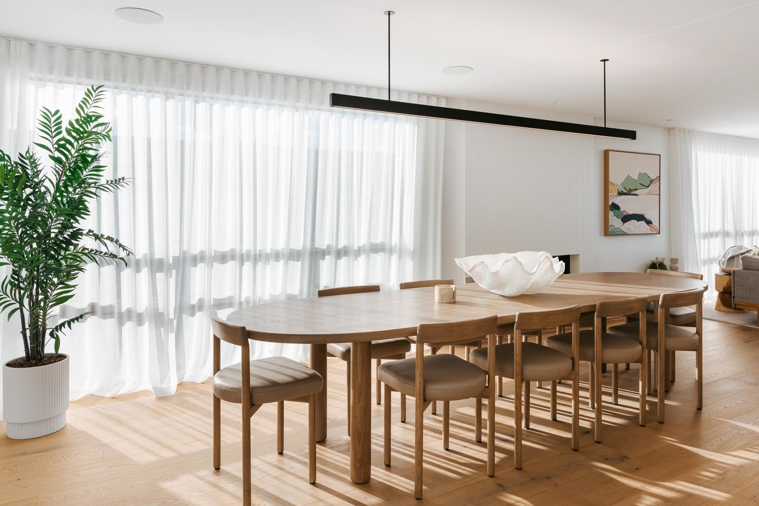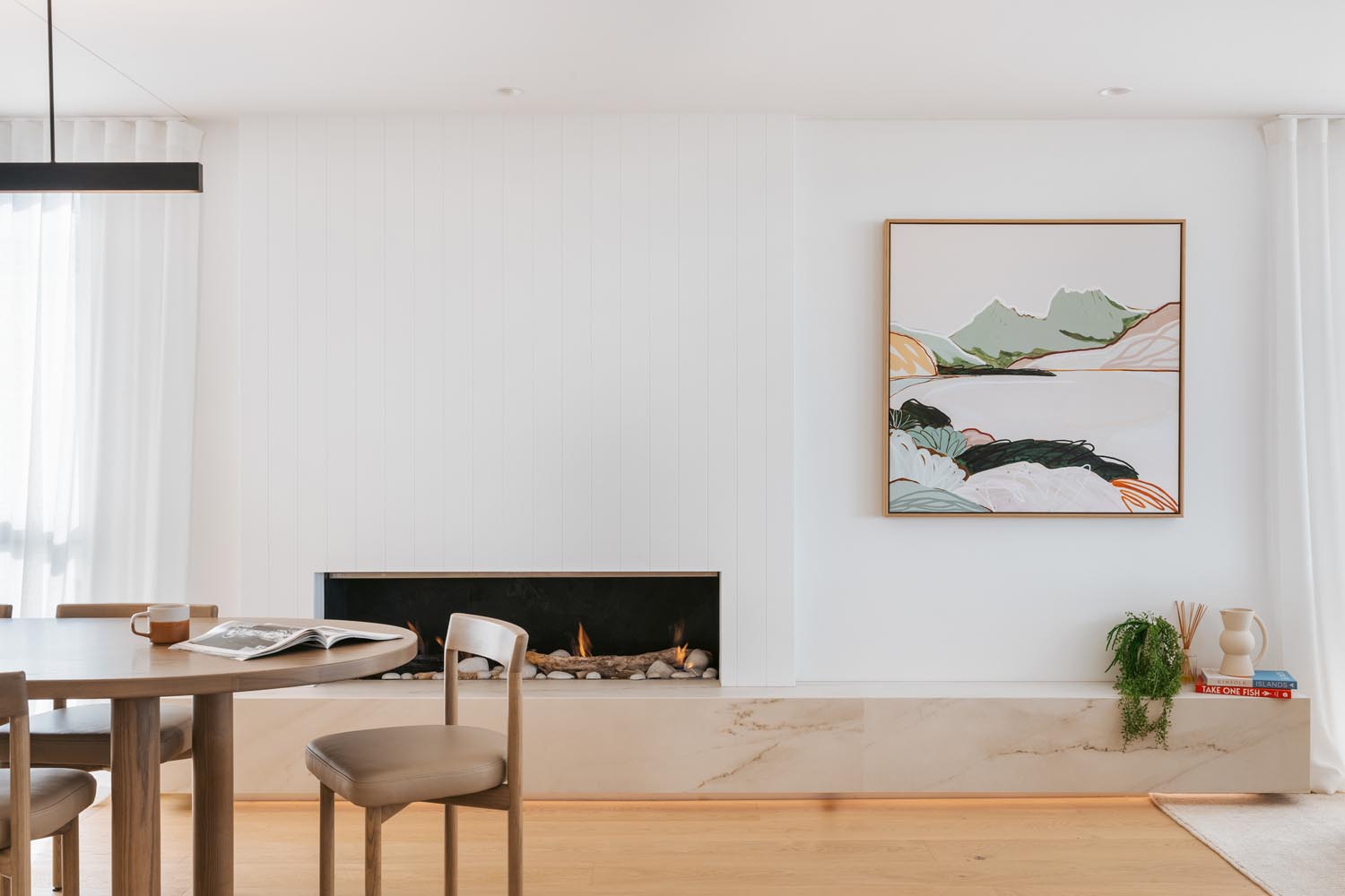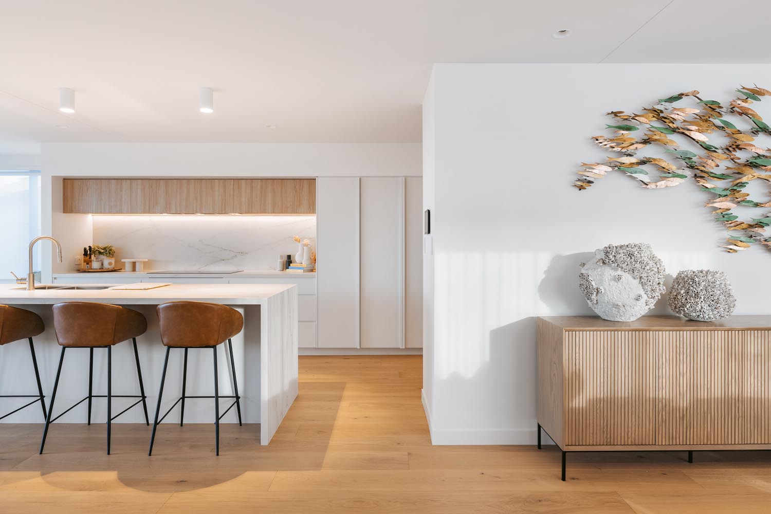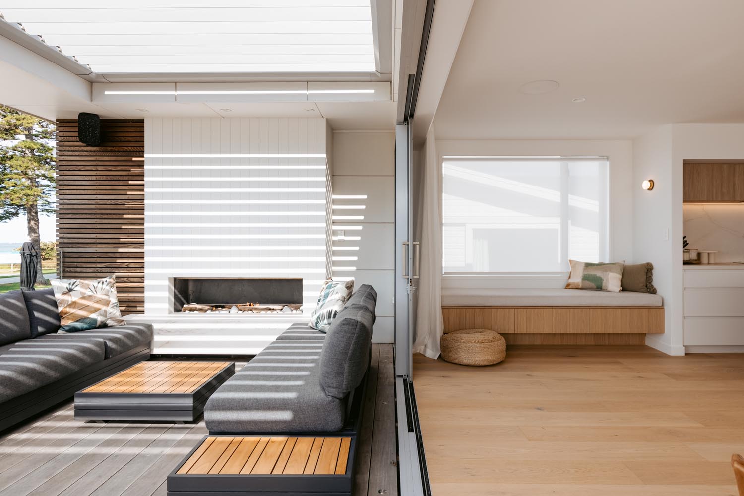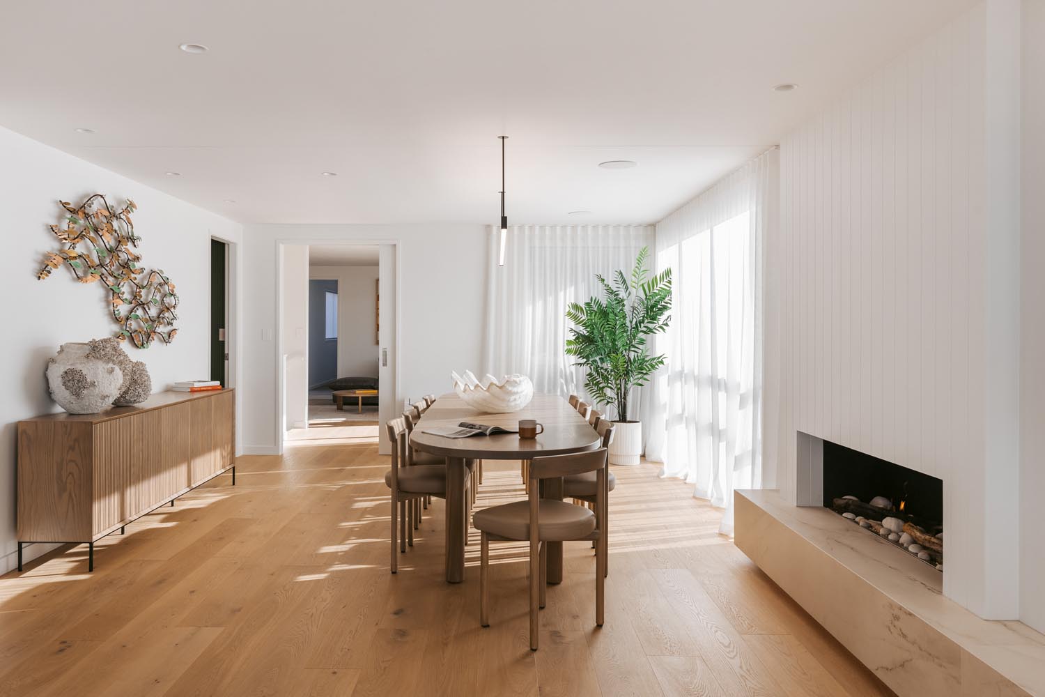 rooms that beckon you to unwind and the living space opens to an expansive deck where you can sit and take in the beautiful ocean panoramas. An outdoor fireplace provides the perfect ambiance, an ideal place to relax with a drink, adding a touch of magic to your evenings. With a state-of-the-art design and ample space in the butler’s pantry, the kitchen offers all the modern conveniences you could need. The easy-to-use home automation system allows you to effortlessly set the mood and environment of the house to your liking. The open-plan dining space enables you to host gourmet meals in style and features a large gas fire, setting the ambience for unforgettable dining experiences.